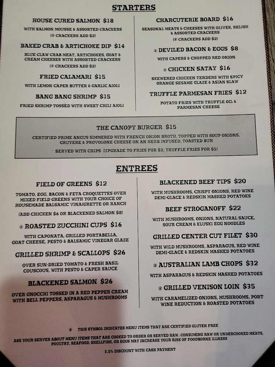 “ The Canopy Lounge is a real treasure! They offer a unique menu and the food never disappoints! It’s always delicious and cooked to perfection. The drink menu is varied and we are always discovering new things to try. Best of all is the exceptional service and, most recently, our server John helped really guide us towards some great choices! We highly recommend The Canopy Lounge! ”